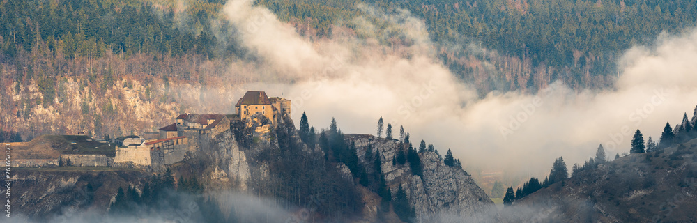Fotografie Le Château de Joux pris dans les brumes matinales
