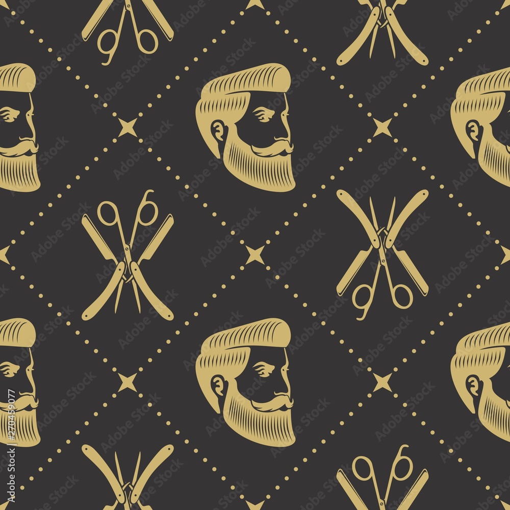 Fotografie Barbershop seamless pattern with hipster face, hairdressing scissors and razor