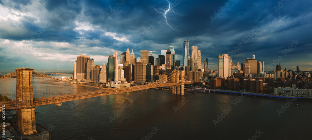 Fotografie Panorama of the lightning over Manhattan island and Brooklyn bridge during stormy sunset