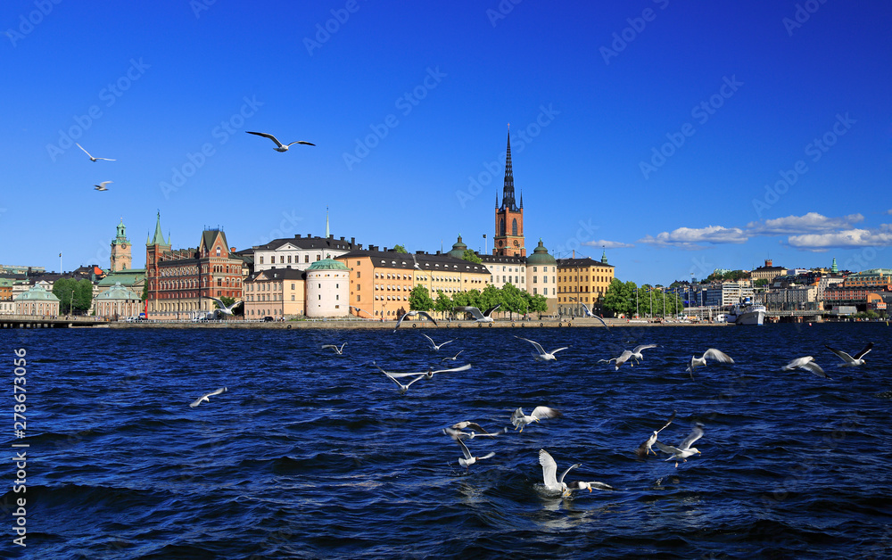 Fotografie Scenic panorama of the Old Town Gamla Stan in Stockholm with lake and seagulls o