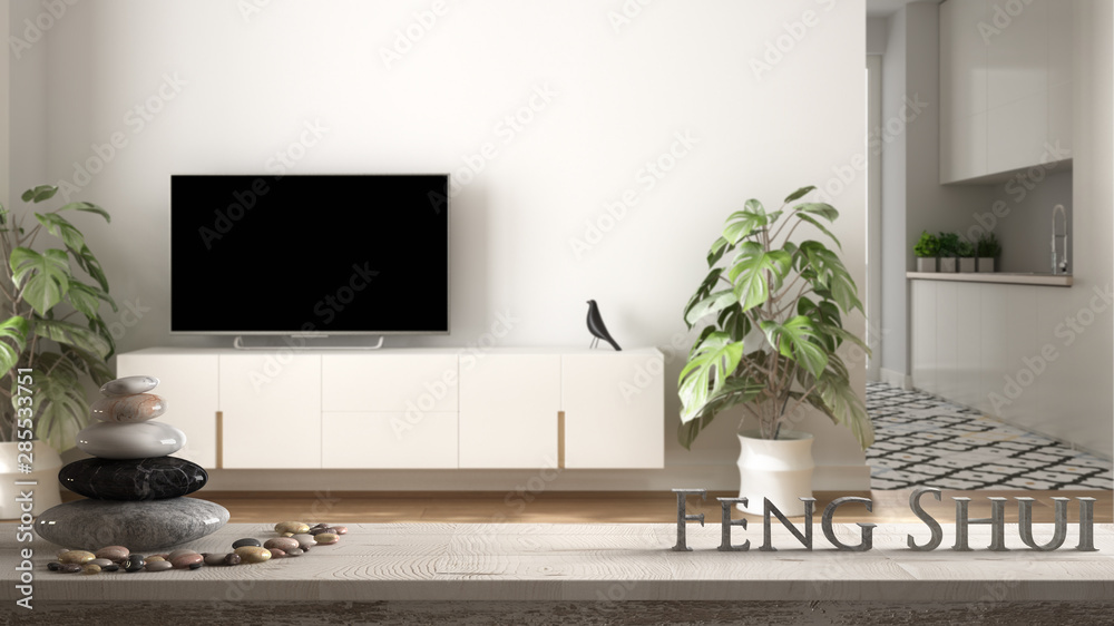 Fotografie White table shelf with pebble balance and 3d letters making the word feng shui o