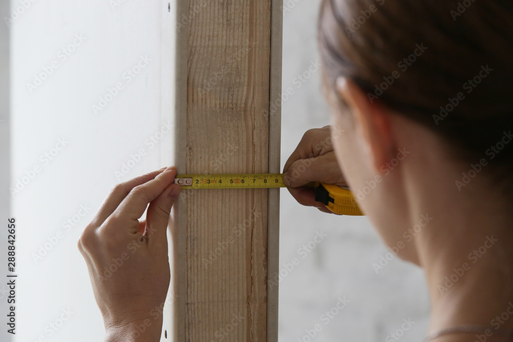 Fotografie Woman holding a meter, measuring dimensions on plasterboard panel - DIY home imp