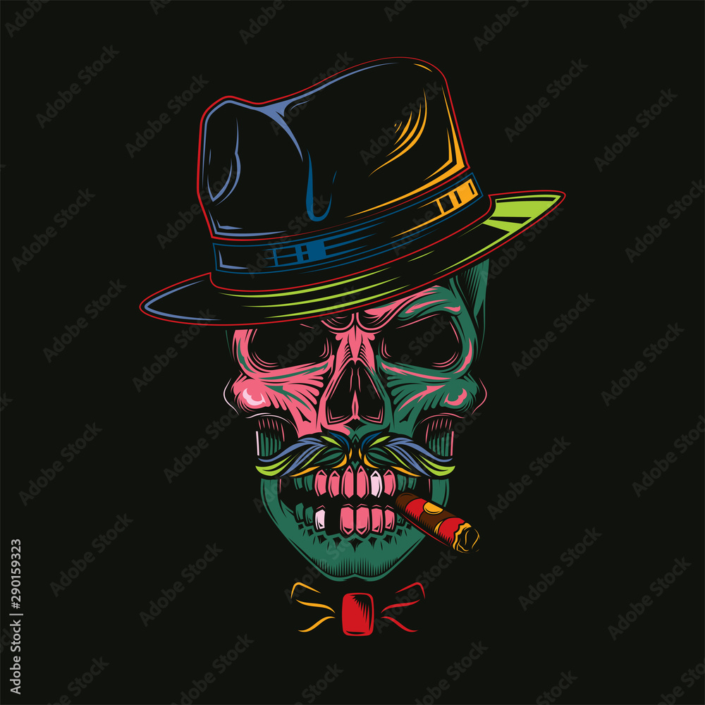 Fotografie Original vector illustration in comic style, skull gangster in hat and cigar in