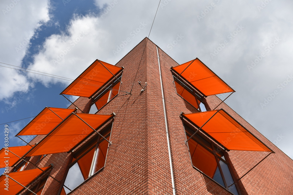 Fotografie colorful orange awnings on windows of building from red brick
