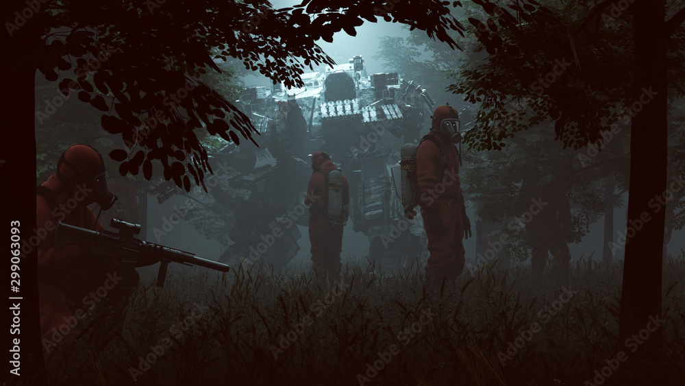 Fotografie Men in Hazmat Suits with Futuristic AI Battle Droid Cyborg Mech with Glowing Len