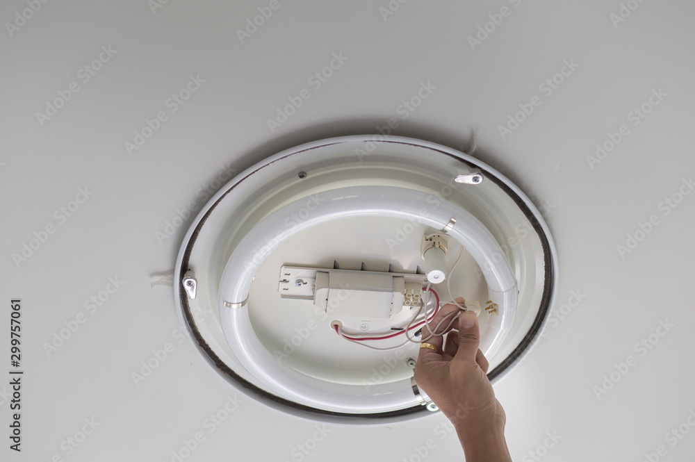 Fotografie Hand holding connector of fluorescent ballast set to installing with fluorescent