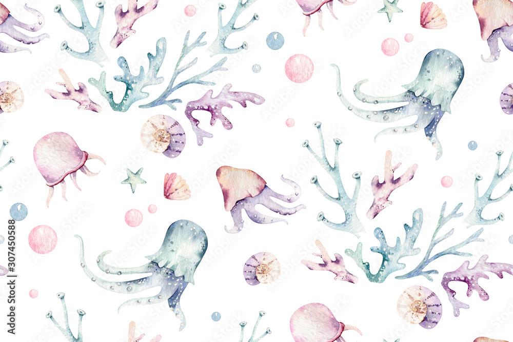 Fotografie Sea animals blue watercolor ocean seamless pettern fish, turtle, whale and coral