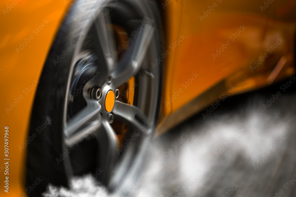 Fotografie Detail on hot red super-sport car wheels with sport breaks