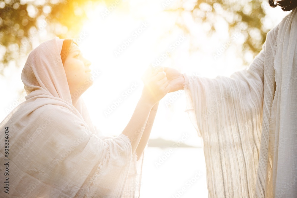 Fotografie Female wearing a biblical robe and grabbing the hand of Jesus Christ for help an