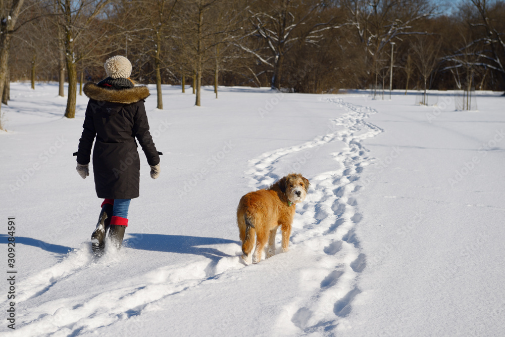 Fotografie Young woman walking her dog in a Park with fresh snow