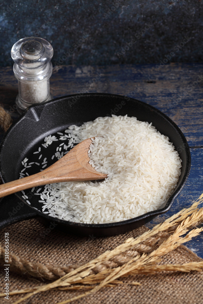 Fotografie Close up white rice in measuring cup on table, Thai Jasmine rice in rustic kitch