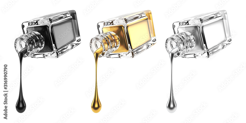Fotografie 3d illustration of metallic shade nail polish bottle with drops, isolated on whi
