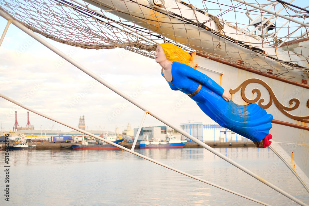 Fotografie A figurehead of a classic sailing ship, a carved wooden female figure decorating the bow