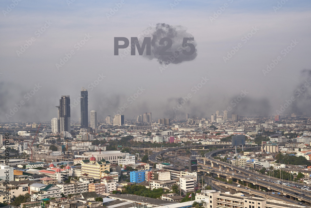 Fotografie Bangkok Thailand- Jan 31, 2020: High angle view of the building in Bangkok a bad day, covered with dust pollution