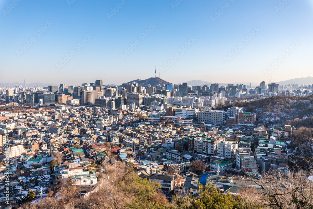 Fotografie 인왕산에서 바라본 서울 도심 낮 풍경과 밤 (야경) 뷰 Seoul Day and Night Skyline from Inwangsan Mounta