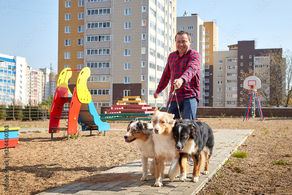 Fotografie Plump man with three dogs walking on children playground in city yard with big b
