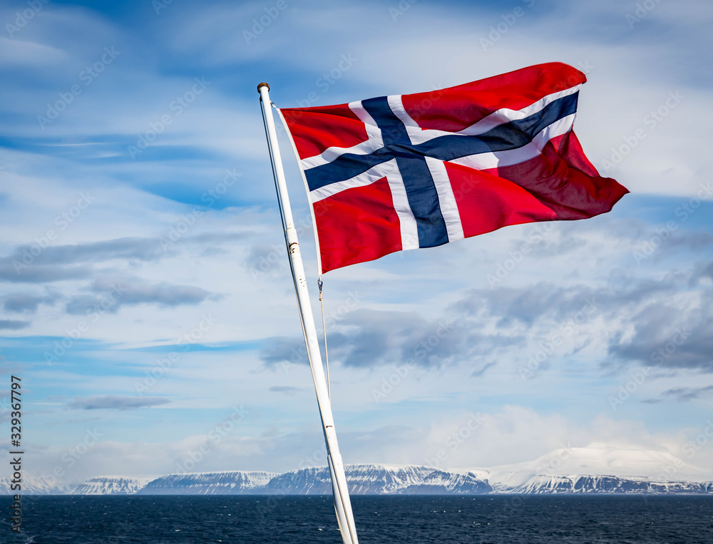 Fotografie Norwegian Flag on the stern of a ship in the Artic circle