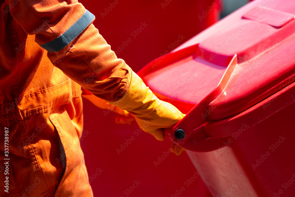 Fotografie Man in protective suit and disposal container for Infectious waste, Infectious waste must be disposed in the trash red bag, Coronavirus protection equipment in medical waste bin