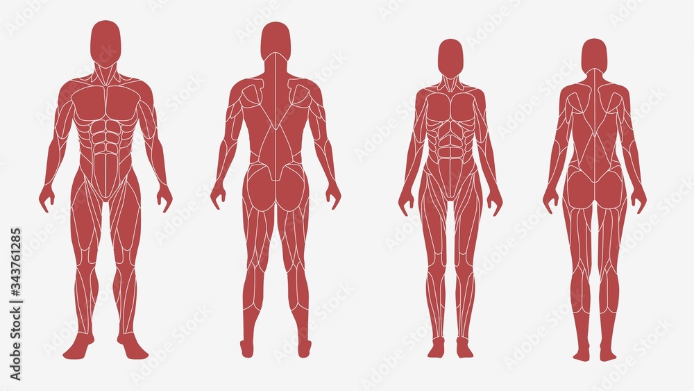Male and female body in an anatomic, muscular illustration. Front and back view - isolated vector illustrations on white background. Used for education system, in sports design, print, sites.