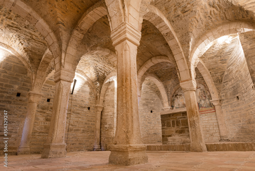 Fotografie Romanic church of Sant'Ubaldo in Apiro,Italy, view of the crypt with columns and
