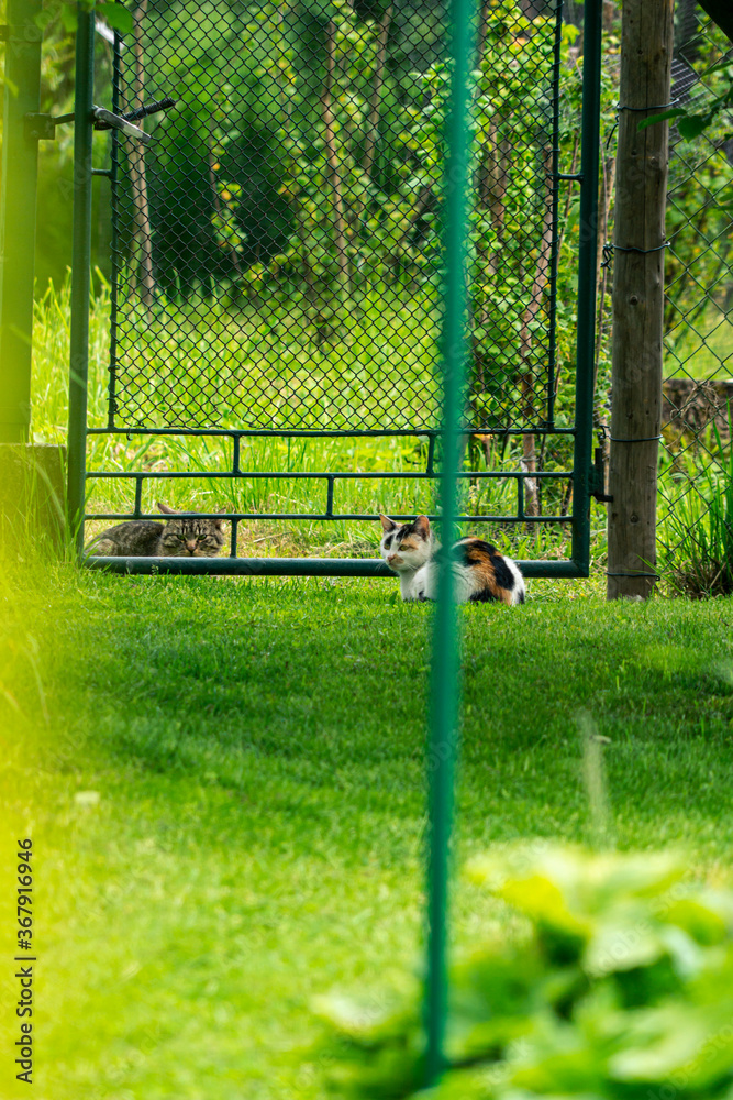 Fotografie Tree-coloured she-cat and tomcat sitting by the green gate opposite one another