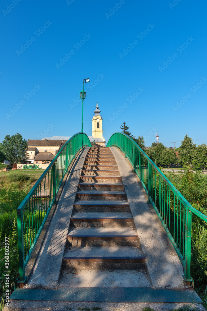 Fotografie Bac, Serbia - July 22, 2020: Pedestrian bridge for crossing the Danube-Tisa-Danube canal in the town of Bac