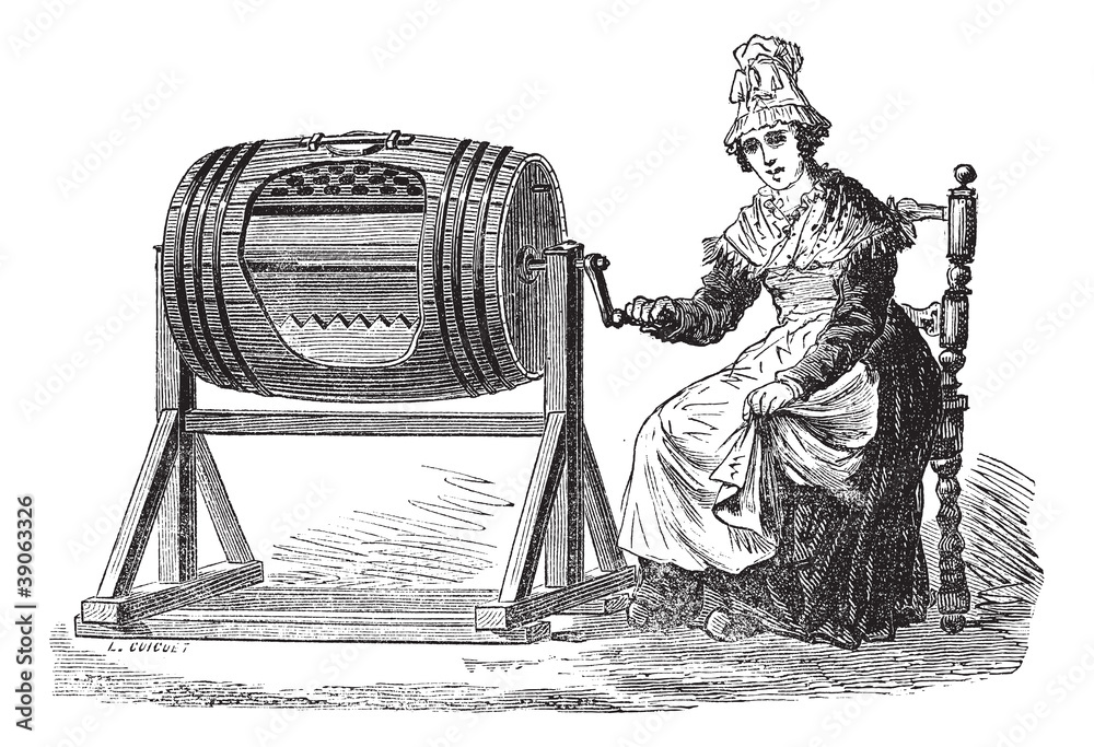 Fotografie Woman using barrel churn for making butter vintage engraving