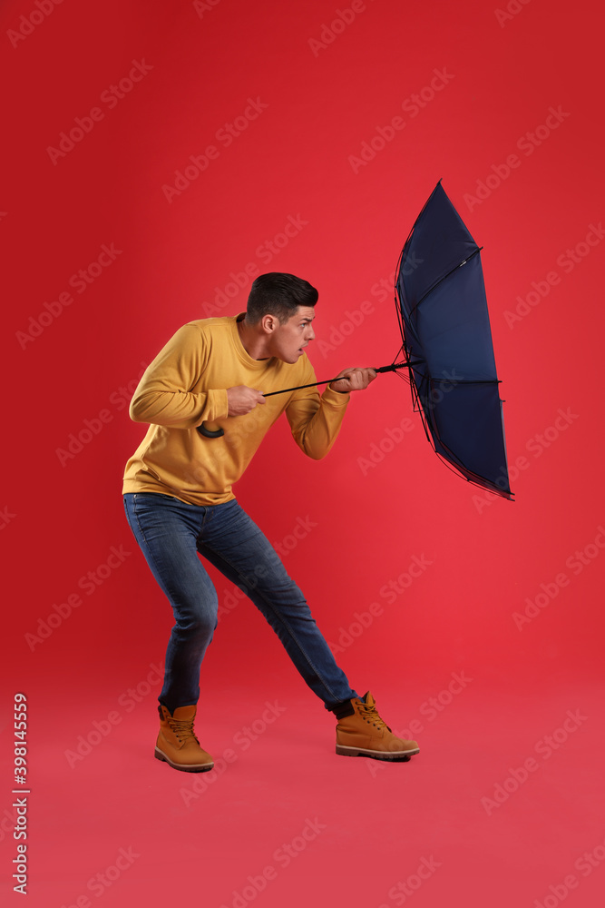 Fotografie Emotional man with umbrella caught in gust of wind on red background