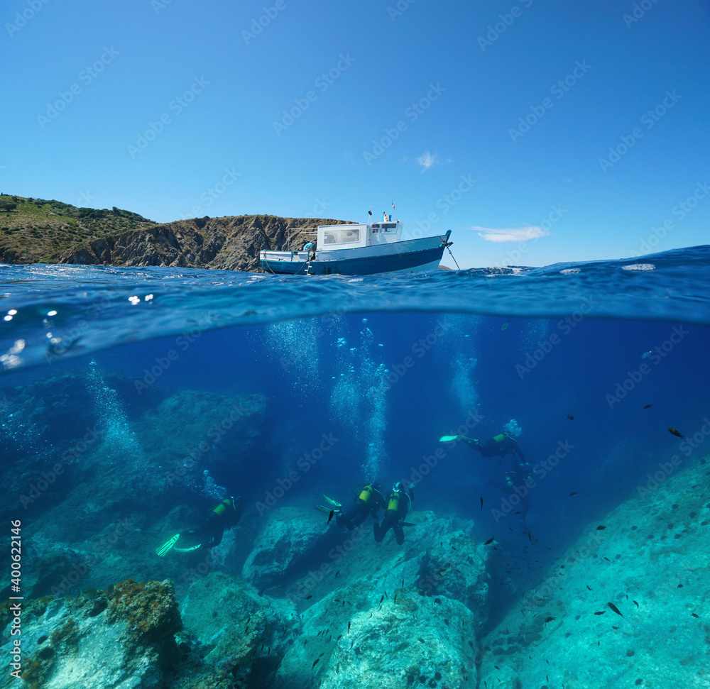 Fotografie Scuba diving, a boat on the surface and scuba divers underwater, Mediterranean s