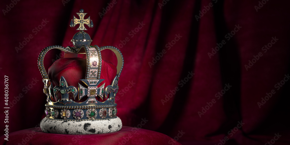Fotografie Royal golden crown with jewels on pillow on pink red background