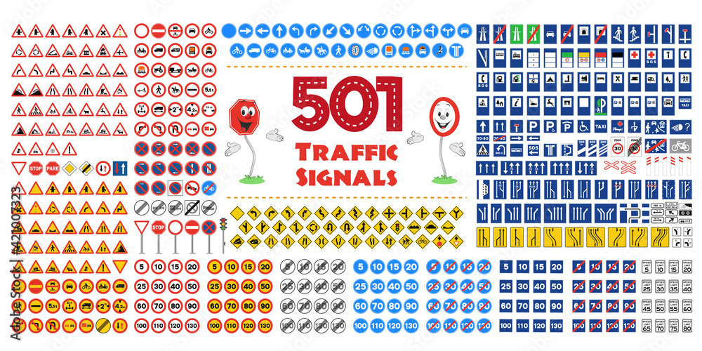 Fotografie Full collection of 501 Traffic or Road signals isolated on white background