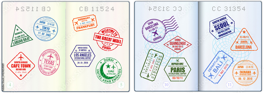 Fotografie set of realistic blank passport pages or empty passport with watermark and stamps or open foreign passport pages