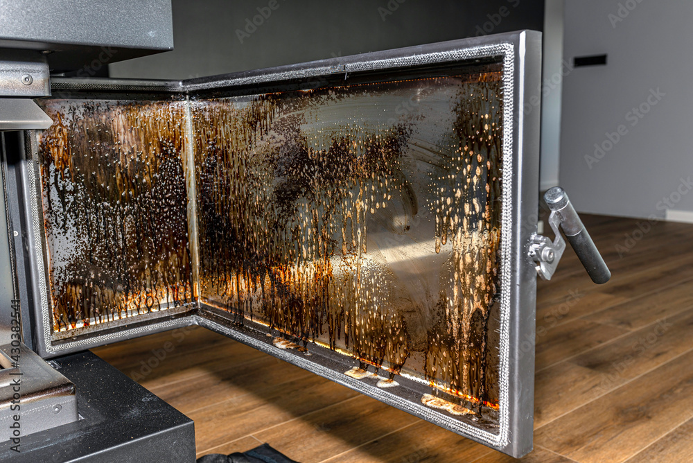 Fotografie Cleaning the corner glass from soot in a modern fireplace with a closed combustion chamber standing in the living room, painted black