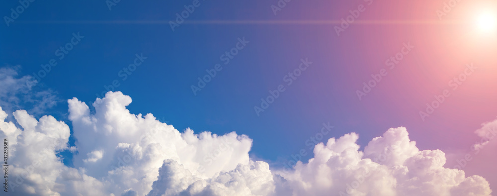 Fotografie Blue sky background with white puffy clouds on a bottom foreground