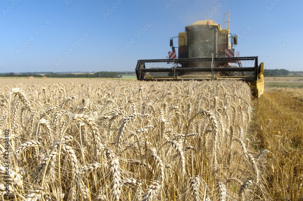 Fotografie Moisson blé. Moissonneuse avec épis de blé en premier plan