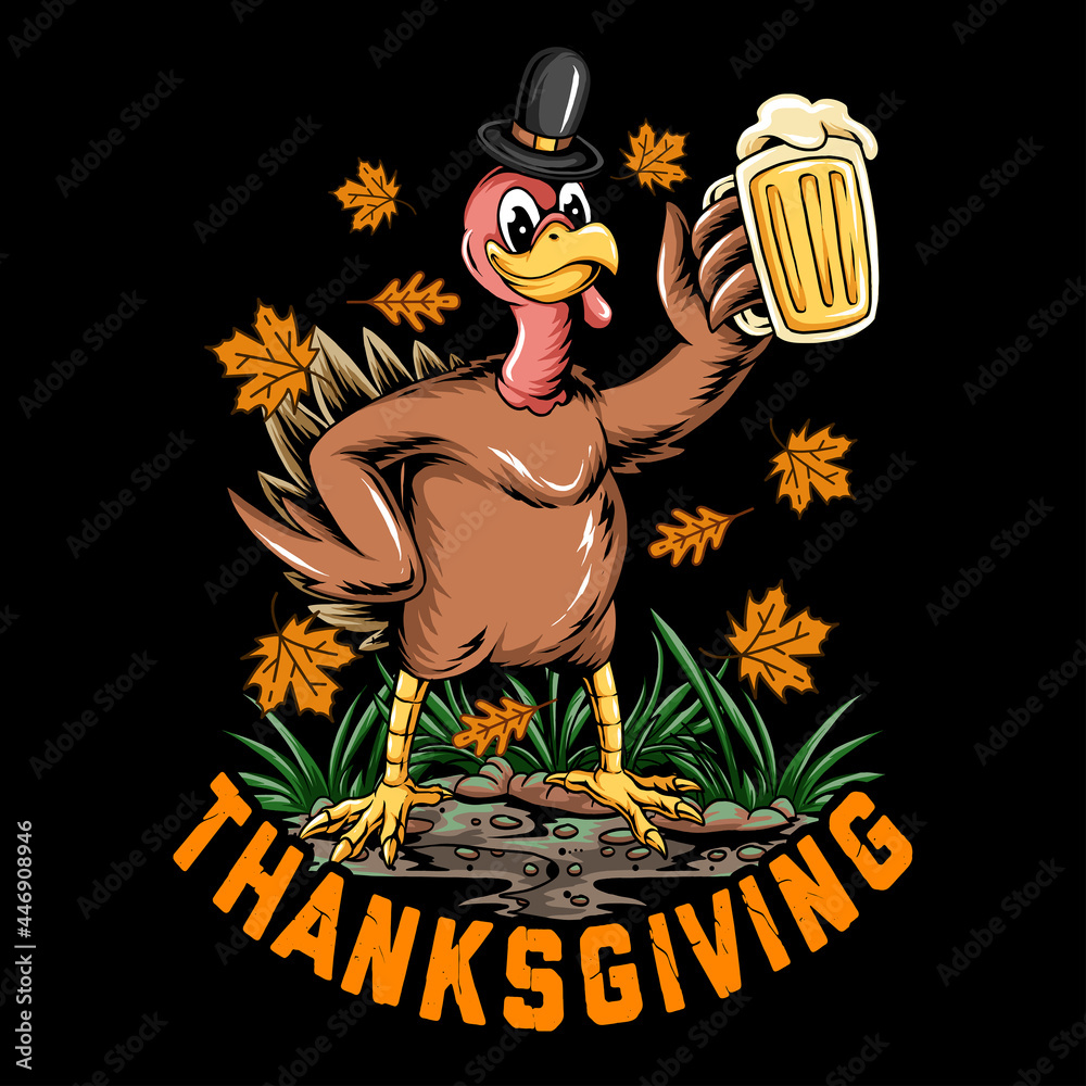 Fotografie thanksgiving holiday turkey holding a big glass of beer at thanksgiving celebrat