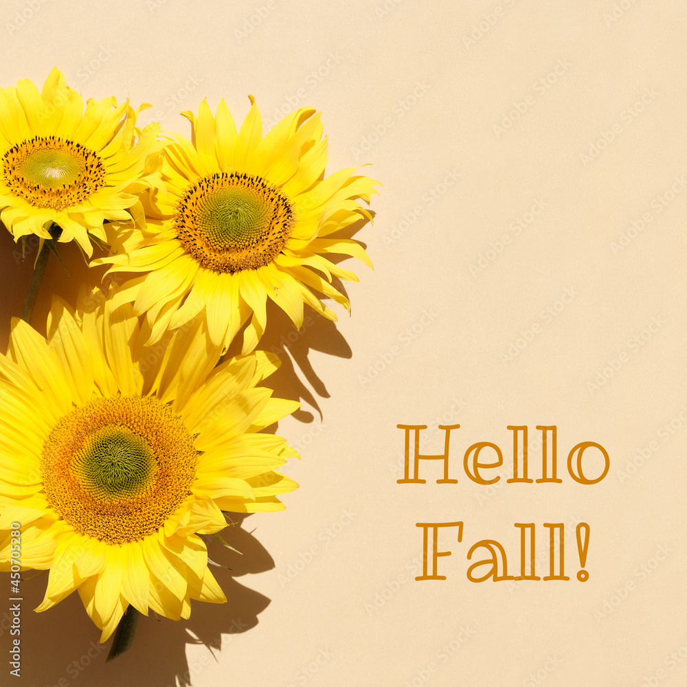 Fotografie Hello Fall, text with sunflowers on square flat lay