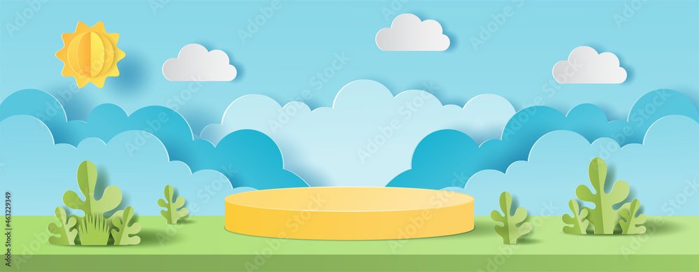 Fotografie 3D paper cut of Summer season on green nature landscape, sun and clouds on blue sky background with circular stage podium