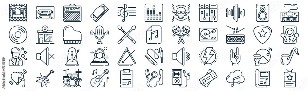 Fotografie music thin line icon set such as pack of simple treble clef, microphone, metrono