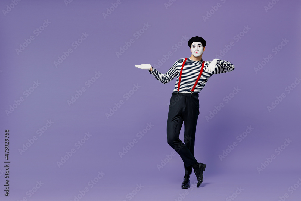 Fotografie Full size body length charismatic bright young mime man with white face mask wears striped shirt beret lean on something invisible isolated on plain pastel light violet background studio portrait