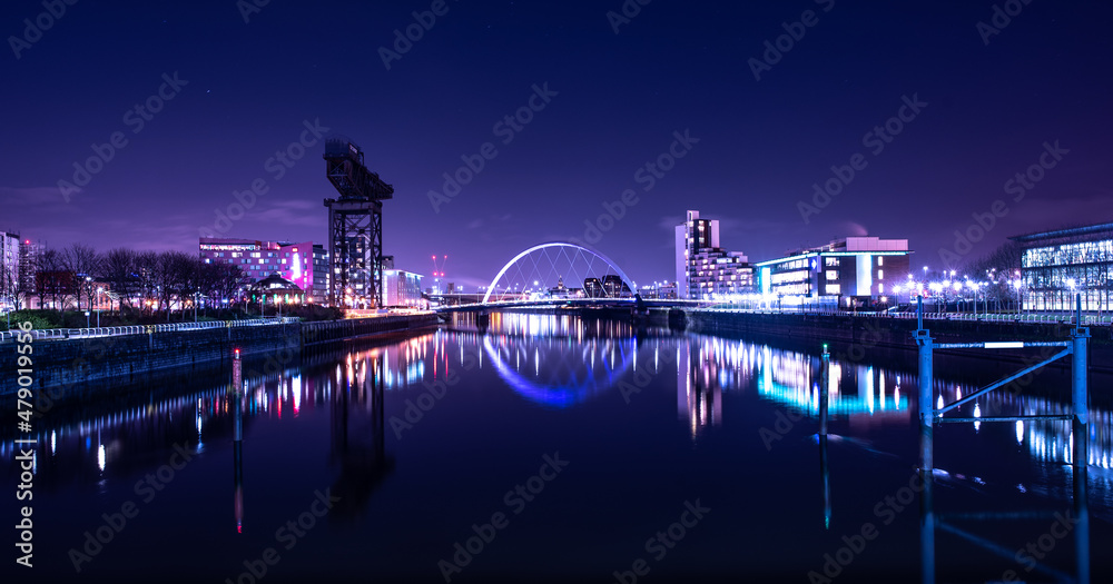 Fotografie City Riverscape at Night with reflections and purple light