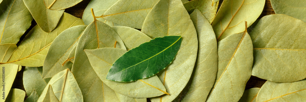 Fotografie Green bay leaf panorama on a background of dried laurel leaves, shot from the to