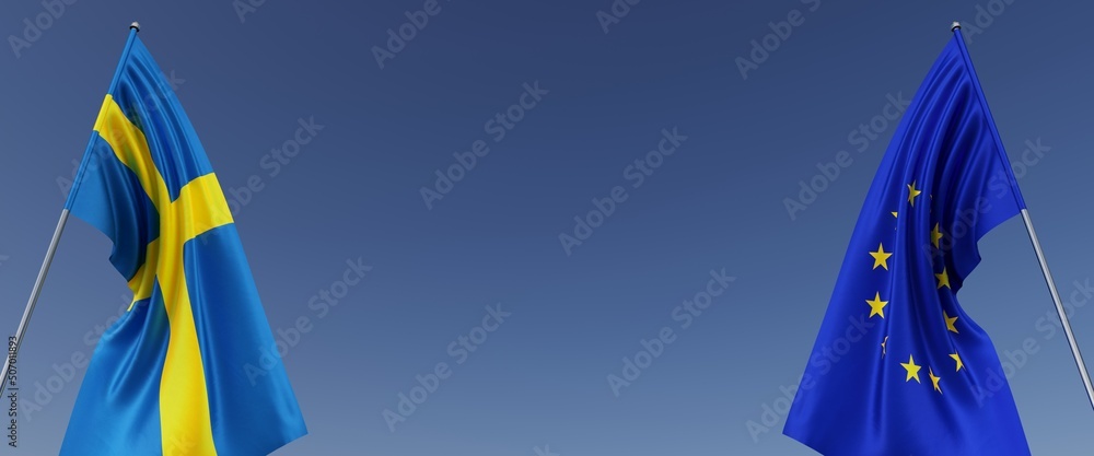 Fotografie Flags of Sweden and the European Union on flagpoles on sides