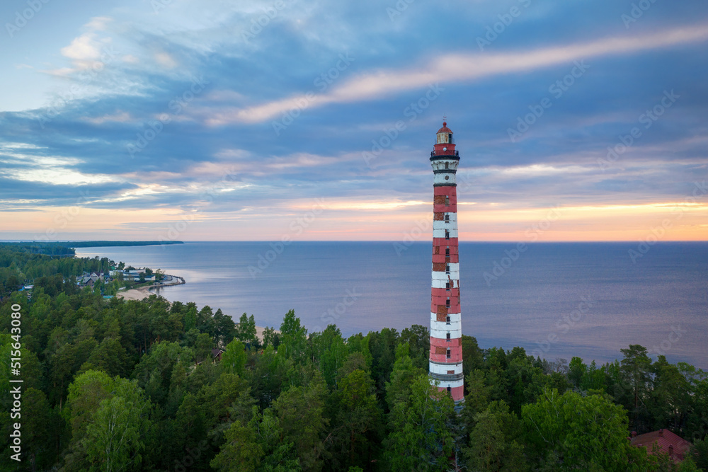 Fotografie Sunrise view of Osinovetsky lighthouse and Ladoga lake