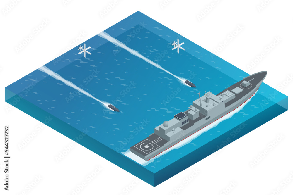 Fotografie Isometric attack of a military naval warship with aerial drones and maritime surface military drones