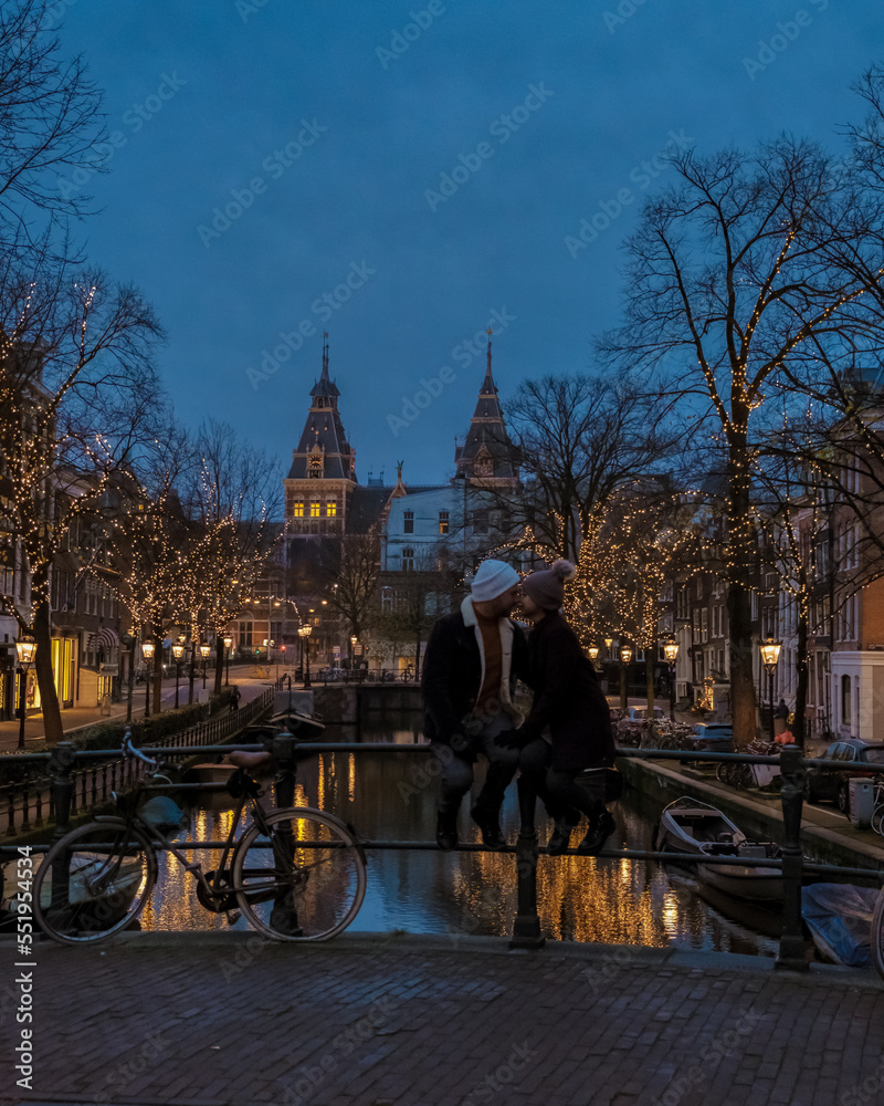 Fotografie Amsterdam Netherlands canals with Christmas lights during December, a couple on