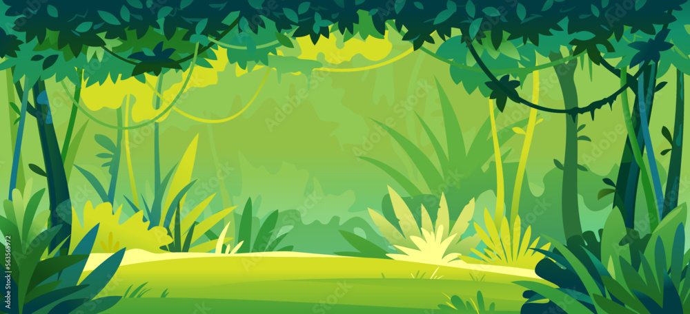 Fotografie Small sunny lawn in wild jungle forest with trees, bushes and lianas, nature lan