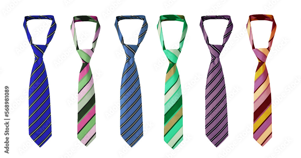 Strapped neckties in different colors, men's striped ties. Isolated on a trensparent background