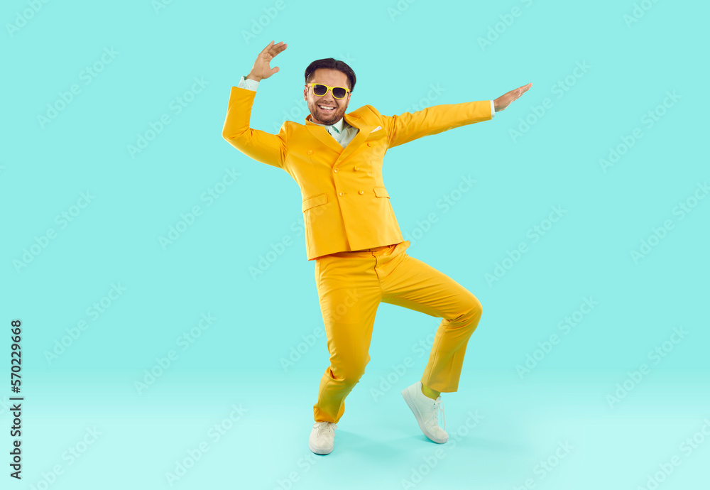 Fotografie Full length portrait of funny showman in yellow suit, sneakers and sunglasses dancing on turquoise background