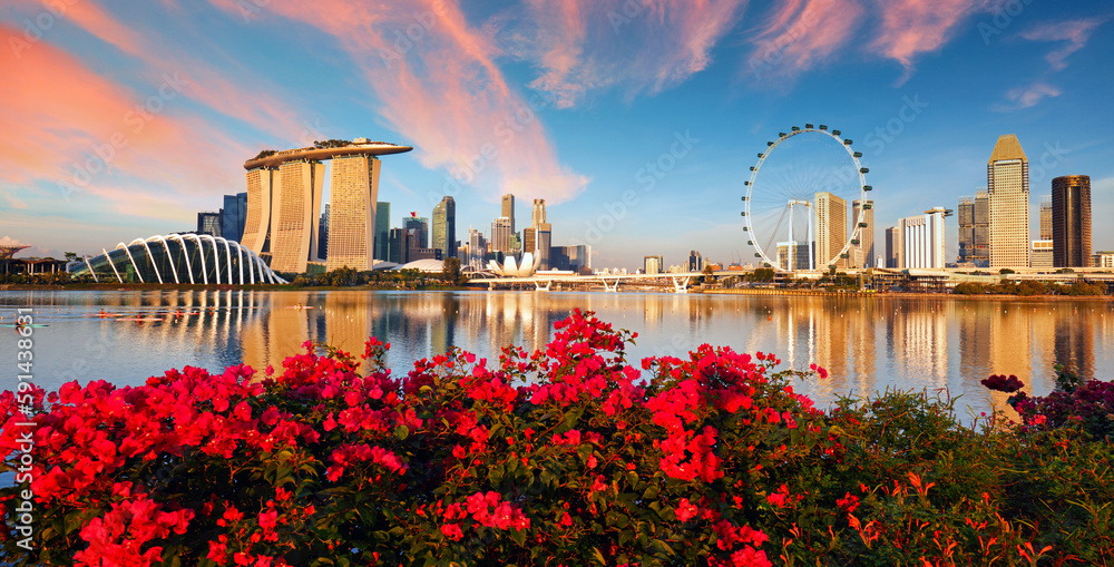 Fotografie View of central Singapore: Marina Bay Sands hotel, Flyer wheel, ArtScience museu